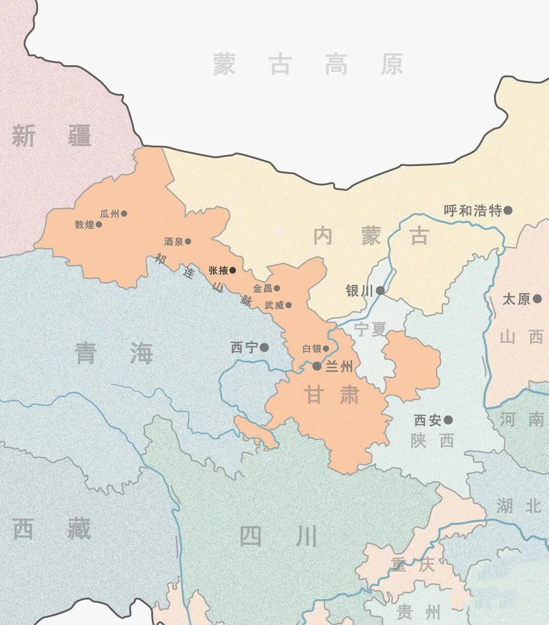 张掖是甘的来源,酒泉(肃州)则是肃的来源,甘肃因此得名