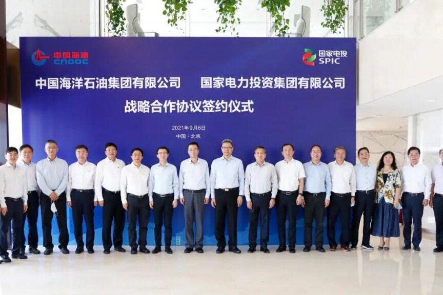 2021年9月6日,在国家电投董事长、党组书记钱智民,中国海洋石油集团董事长、党组书记汪东进的共同见证下,国家电投副总经理、党组成员刘明胜与中国海油董事、党组副书记兼有限公司首席执行官徐可强代表双方签署战略合作协议。