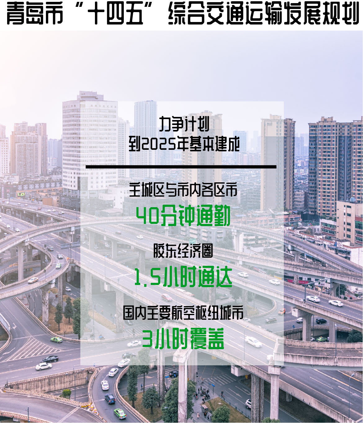 为加快实现交通强国建设目标,打通经济发展动脉。9月3日,山东省青岛市政府新闻发布会上,《青岛市“十四五”综合交通运输发展规划》(简称《规划》)正式发布。“十四五”期,青岛将围绕打造具有全球竞争力的国际性综合交通枢纽总目标,依托港口和航空两大着力点,重点发力交通基础设施建设、客运服务提升、物流降本增效、可持续交通发展、开放环境打造、行业治理能力提升六大领域,力争到2025年基本建成“主城区与市内各区市40分钟通勤、胶东经济圈1.5小时通达、国内主要航空枢纽城市3小时覆盖”的综合交通网。
