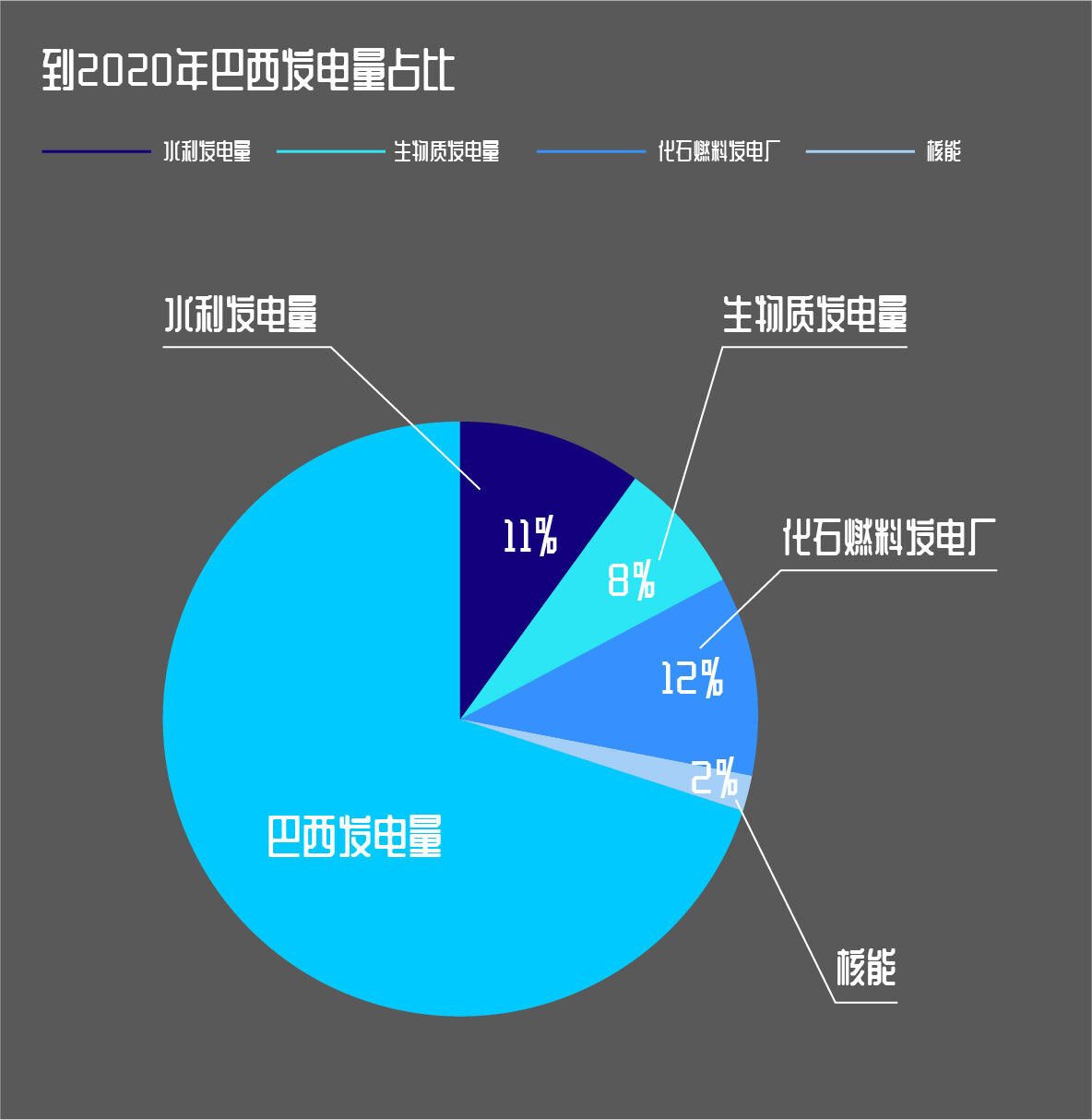 美国能源信息署(EIA)的分析显示,除了水力发电外,巴西的风能和太阳能发电量也在增长,到2020年,巴西的水电发电量将占巴西总发电量的11%。生物质发电量占8%,化石燃料发电厂占发电量的12%,核能占2%。