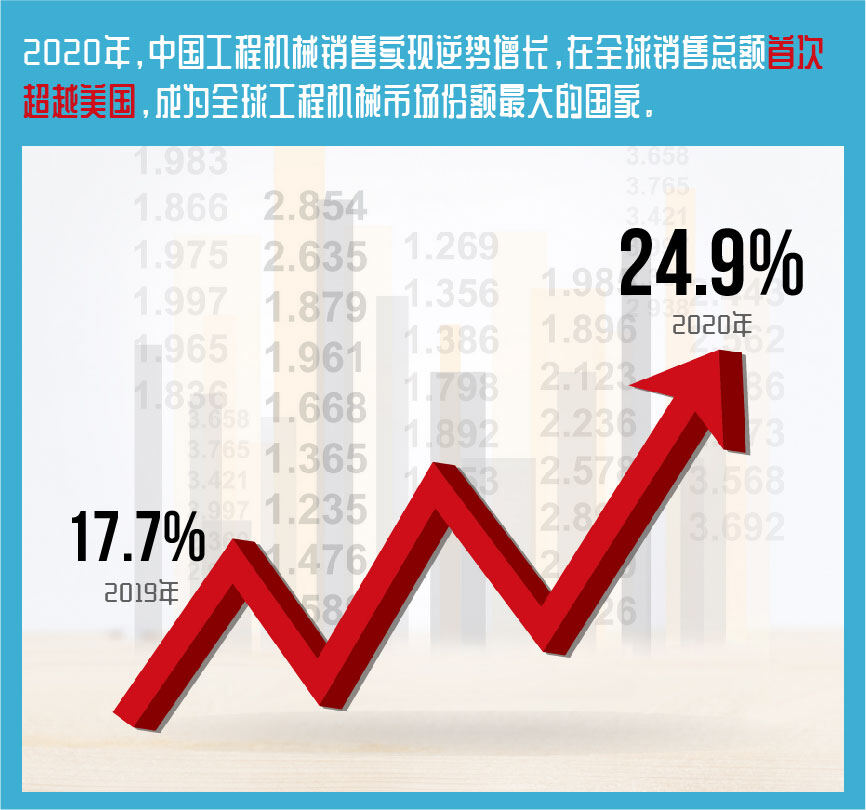 2020年,中国工程机械销售实现逆势增长,在全球销售总额的占比从上年度的17.7%激增到24.9%,首次超越美国,成为全球工程机械市场份额最大的国家。而在2003年,仅仅为1.6%。三一重工2020年挖掘机械销量达98705台,国内市场连续十年蝉联第一,并首次夺得全球销量冠军,占据15%的市场份额。