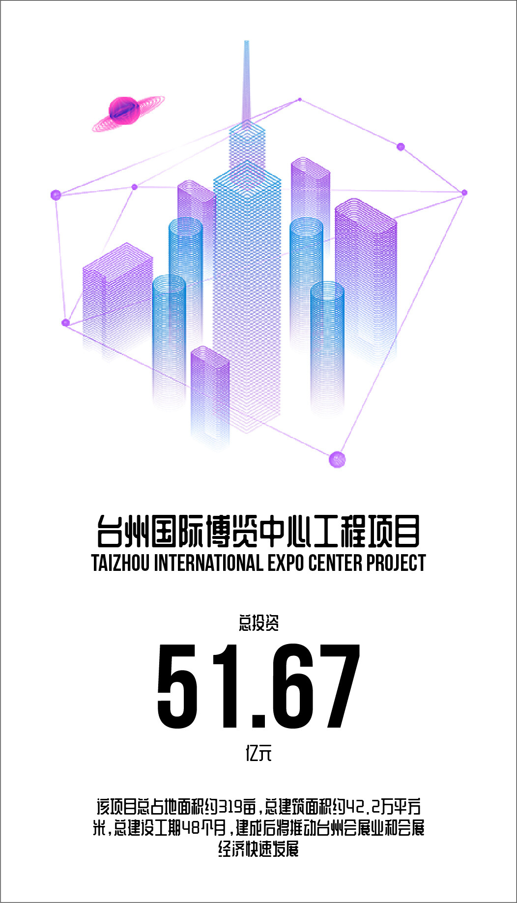 台州国际博览中心项目位于市商贸核心区中心商圈,紧邻台州银泰城和心海绿廊,总占地面积约319亩,总建筑面积约42.2万平方米,总投资概算约51.67亿元,是集展览、会议、办公、酒店、商业等功能为一体的大型会展中心,被列入省重大产业龙头项目、省大都市区建设标志性工程项目。