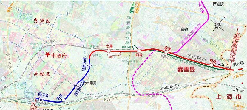 根据嘉兴至枫南线可研报告推荐方案,线路以嘉兴南站北广场百川路为起点,途经嘉兴国际商务区、南湖区、嘉善县,终点至嘉善枫南浙沪边界,规划在金山区枫泾镇与上海市域南枫线衔接。