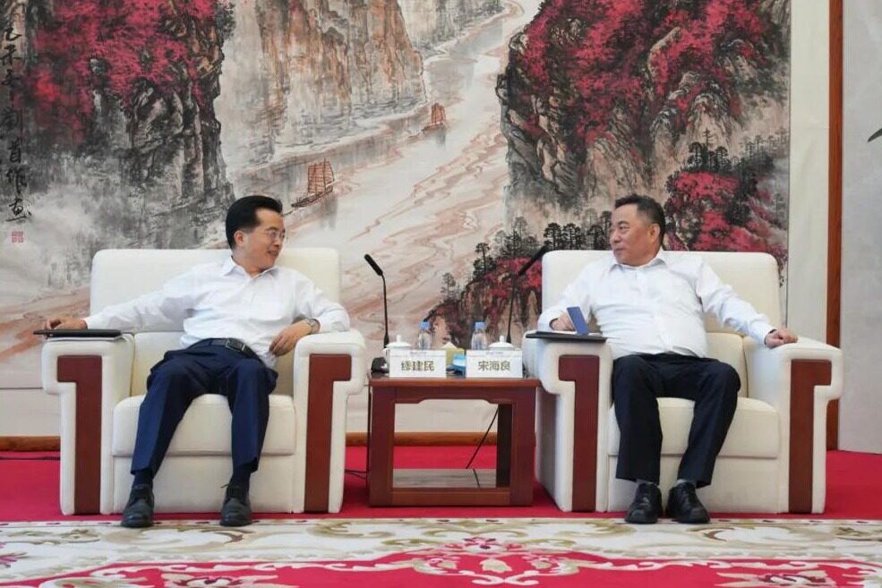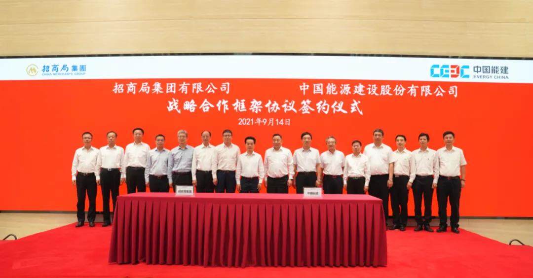 2021年9月14日下午,中国能建党委书记、董事长宋海良,党委副书记、总经理孙洪水在公司总部与招商局集团党委书记、董事长缪建民座谈,并见证双方签订战略合作协议。