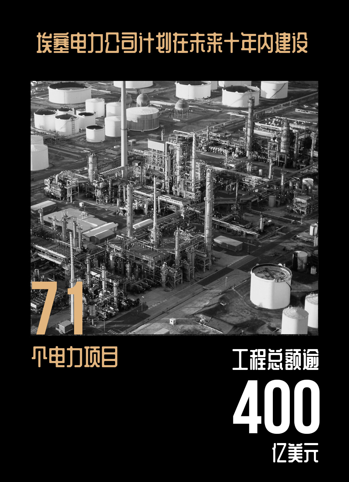 埃塞电力公司计划在未来十年内建设71个电力项目,工程总额逾400亿美元。埃塞电力公司首席执行官阿什伯·巴尔查表示,上述项目资金来源于埃塞政府及电力公司、非洲开发银行、世界银行及其他发展合作伙伴等,具体包括16个水电项目、24个风电项目、17个地热项目和14个太阳能发电项目。