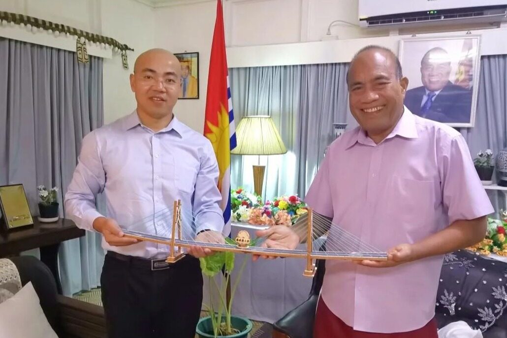 A few days ago, Kiribati President Tanesh Mamo and his wife Terun Mamo received Wang Gang, deputy general manager of the South Pacific Regional Headquarters of China Railway First Bureau, and his entourage at the Presidential Palace in Tarawa. President Ma Mao reviewed the achievements made by China and Kyrgyzstan since the resumption of diplomatic relations, introduced the development plan of the Kyrgyzstan government in the next two decades, and welcomed and appreciated the participation of China Railway First Bureau in the construction of Kiribati. He pointed out that the current relationship between China and Kyrgyzstan is solid and stable. After the epidemic eases, the cooperation and exchanges between the two countries will be further deepened. It is hoped that the China Railway First Bureau can take full advantage of the comprehensive advantages of Chinese-funded enterprises, actively participate in the Kiribati development planning project and the construction of the China-Base One Belt and One Road project, and realize its own development. The government is willing to create a good business environment for the development of the China Railway First Bureau in Base.