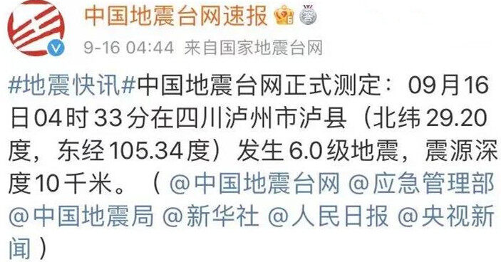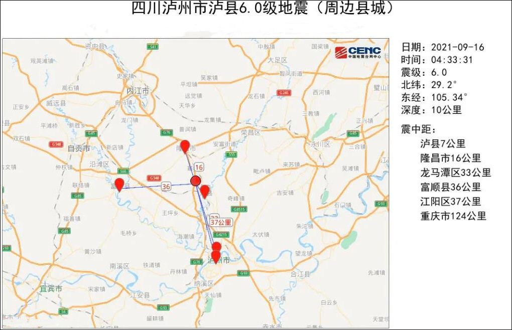 据中国地震台网正式测定,2021年9月16日4时33分,在四川泸州市泸县发生6.0级地震,震源深度10千米,震中位于北纬29.20度,东经105.34度。