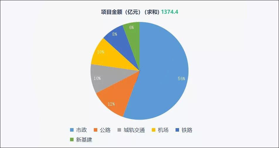 前8个月,在基础设施新签合同额超4500亿元的情况下,20亿+重大项目累计就有约40项,合同总额达1374亿元,占比超30%。这其中,又以市政工程体量最大,项目合同额占比过半;公路、城轨交通、机场、铁路等交通基础设施类项目占比约四成,剩余的约6%则为新基建通信工程项目。