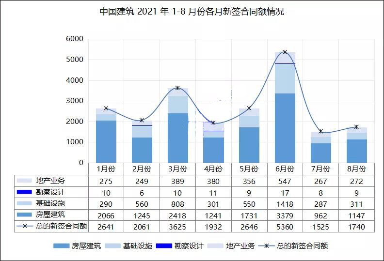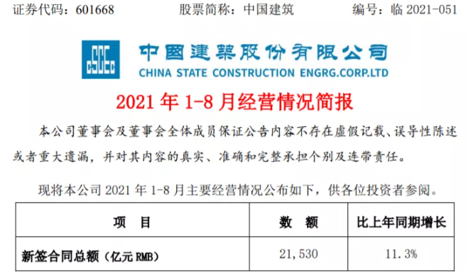 说到基建,很多投资者会首先想到中国建筑。2021年9月15日,中国建筑股份有限公司2021年1-8月经营情况简报正式披露,公告显示,截止8月底,中国建筑新签合同额达21530亿元,同比增长11.3%。相比较7月份累计新签额,8月份中国建筑月揽1740亿大单。