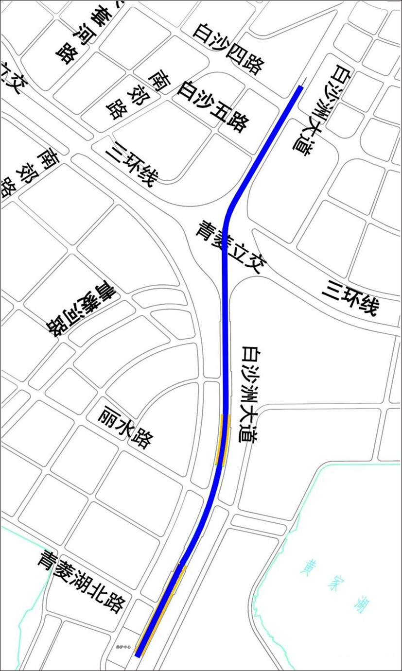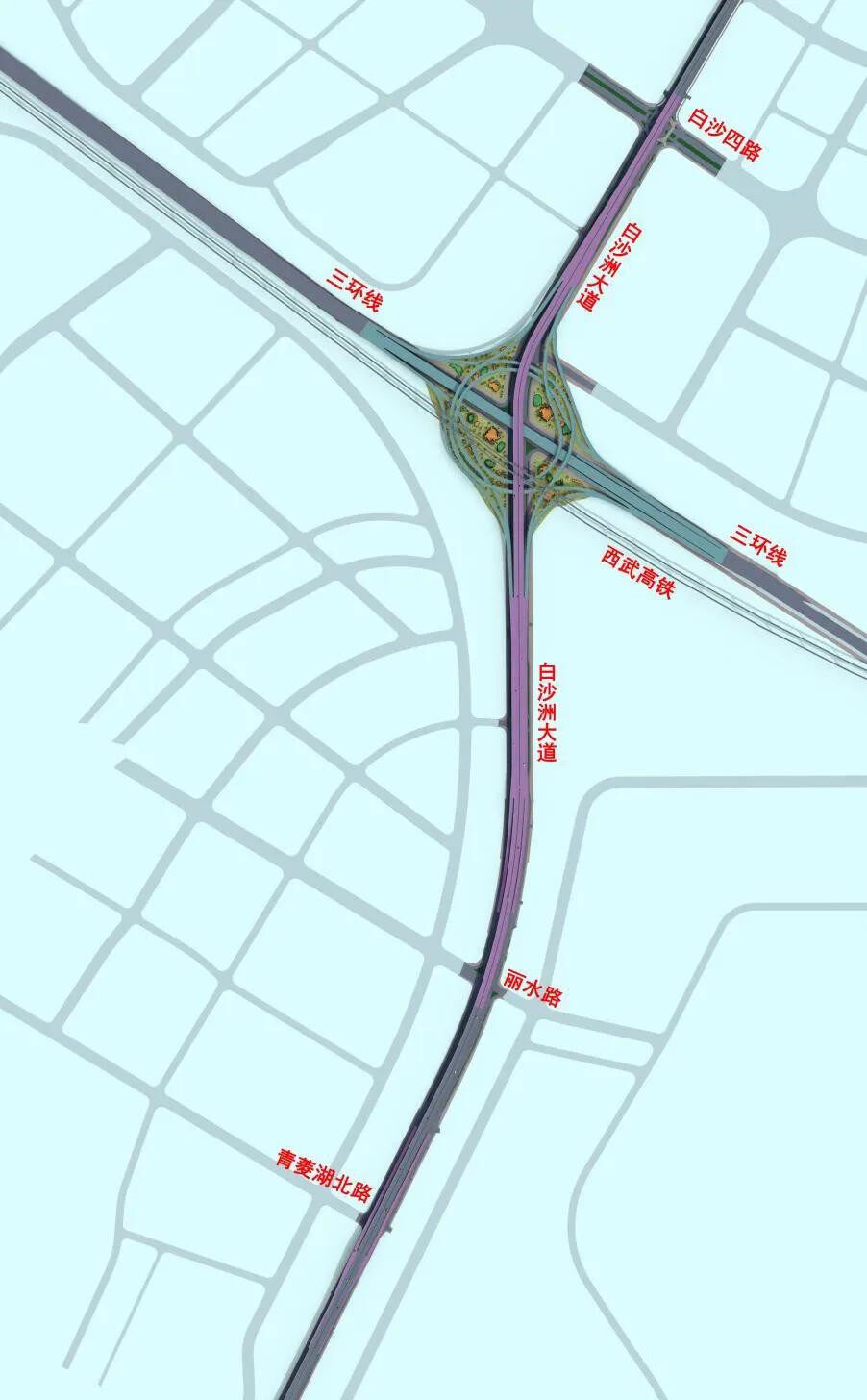 该项目地处武汉南大门,通过此次改造将实现白沙洲大道全程高架贯通,从武昌火车站旁的梅家山立交可通过白沙洲大道高架直接跨越白沙四路、三环线及青菱立交匝道、丽水路、青菱河等地面层直达青郑高速。