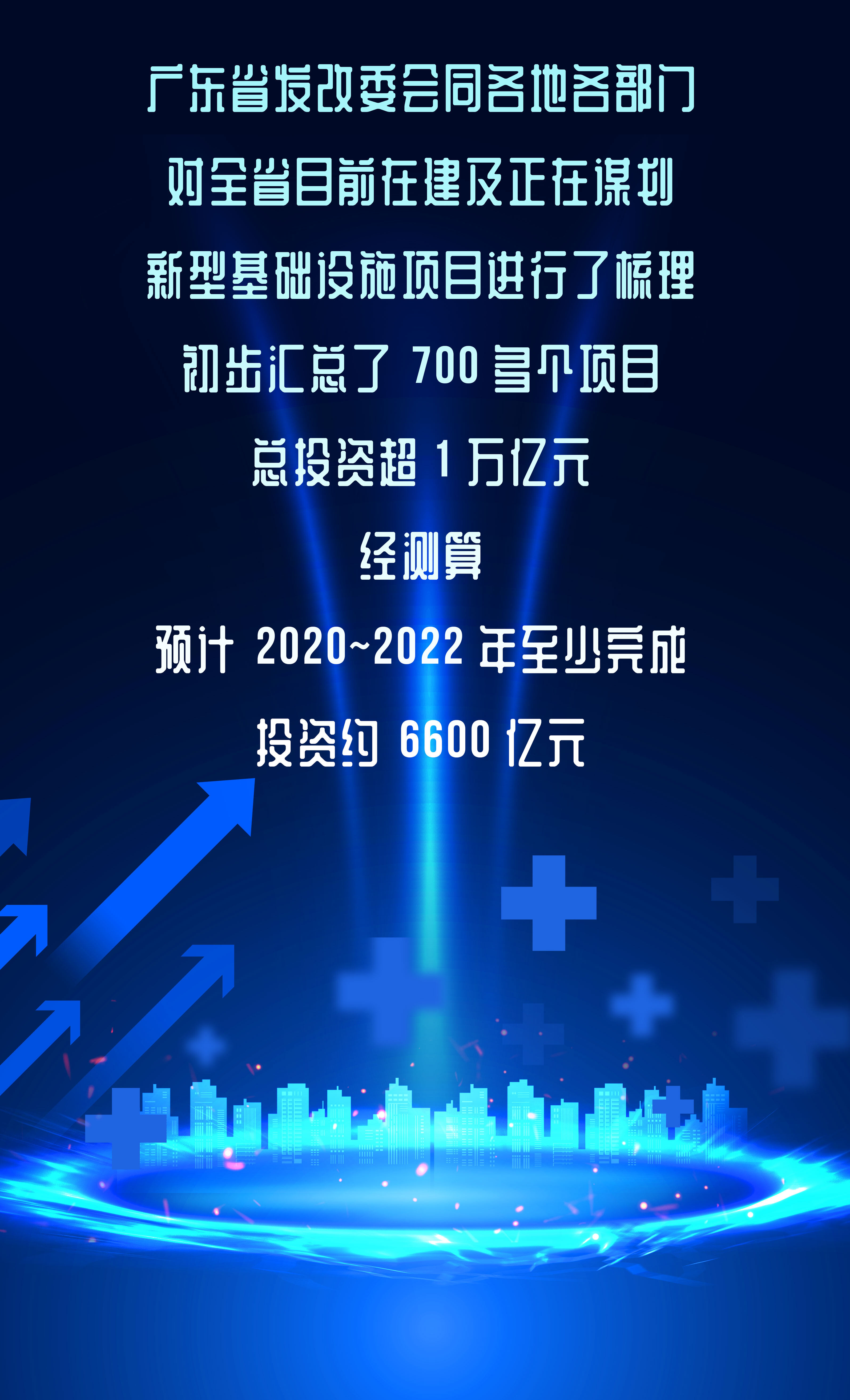 2020年11月,广东印发了推进新基建三年实施方案。广东省发改委会同各地各部门,对全省目前在建及正在谋划的新型基础设施项目进行了梳理,初步汇总了700多个项目,总投资超1万亿元。经测算,预计2020~2022年至少完成投资约6600亿元。