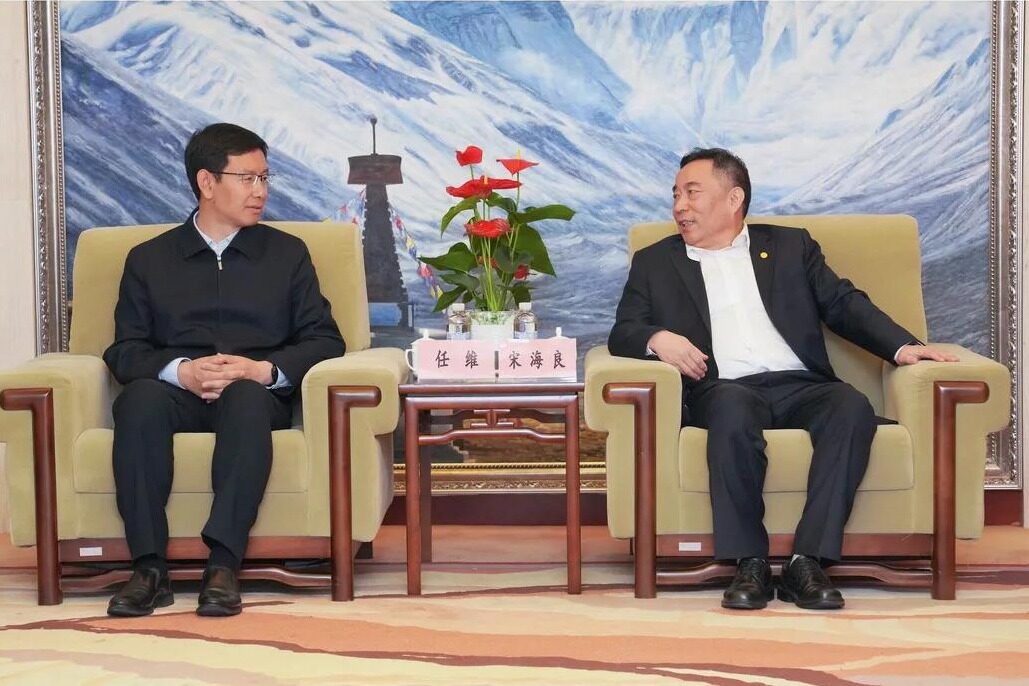 仪式前,宋海良与任维交流座谈。宋海良简要介绍了中国能建在推动西藏经济发展、助力基础设施建设、促进地方就业的有关情况和西藏研究院的组建情况。任维对中国能建在西藏设立研究院表示肯定,希望西藏研究院能够做好智库支撑工作,为西藏清洁可再生能源的高质量发展贡献智慧和力量。