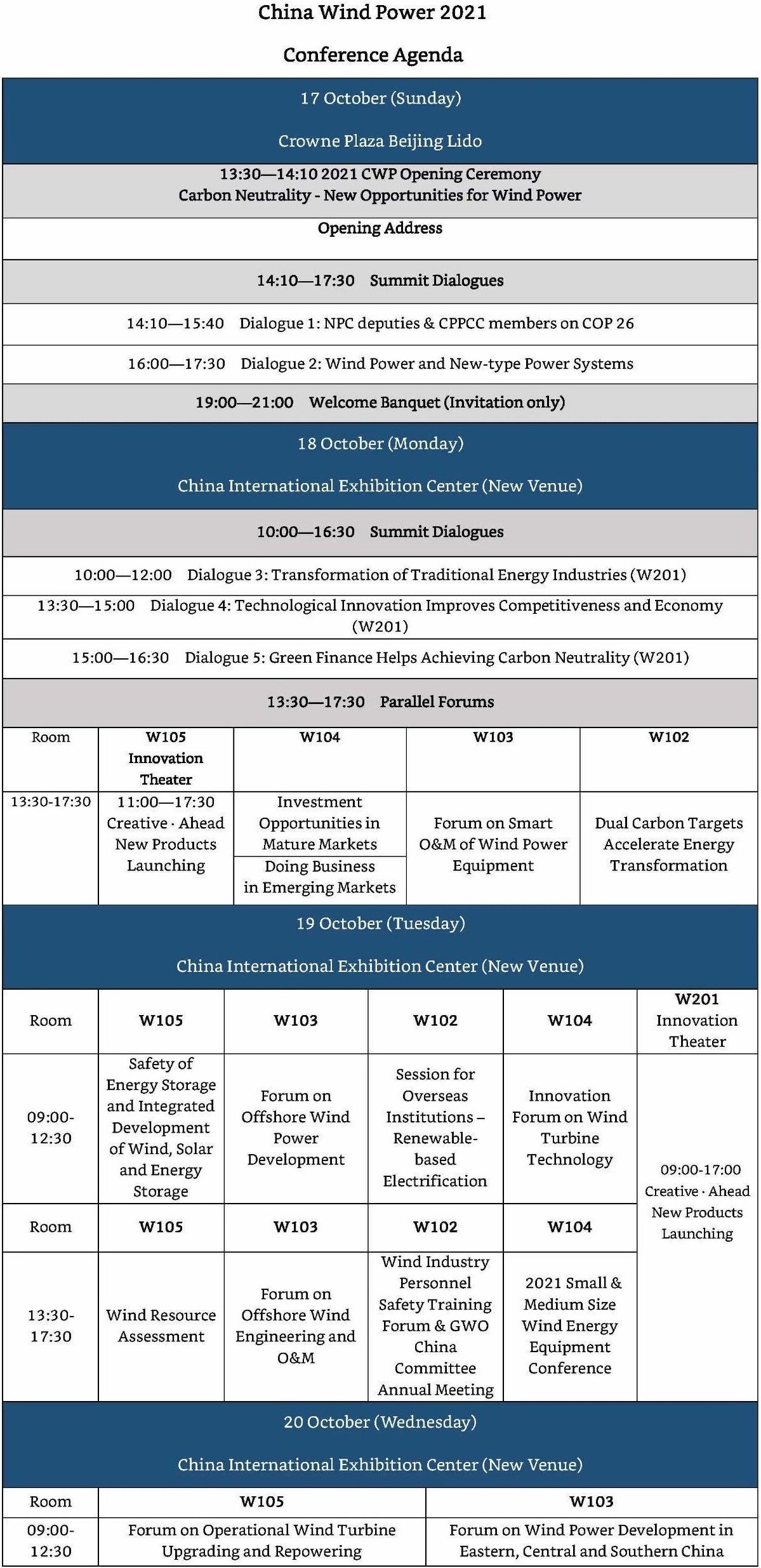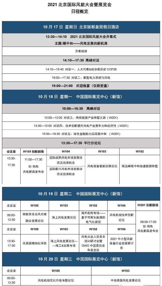 以下为具体日程:2021北京国际风能大会暨展览会(CWP2021)将于金秋十月在京召开。大会将诚邀全球风能领域专家及产业链企业代表,汇聚国内外优质资源,以产业协同发展及技术融合创新为出发点,从更广阔和更有前瞻性的视角探讨碳中和背景下全球风电发展所面临的机遇与挑战。中外风电同仁将齐聚一堂,探索全球能源转型之路,共谋产业健康持续发展之道。(转载请注明见道网 www.seetao.com )见道网工程栏目编辑/邢文涛