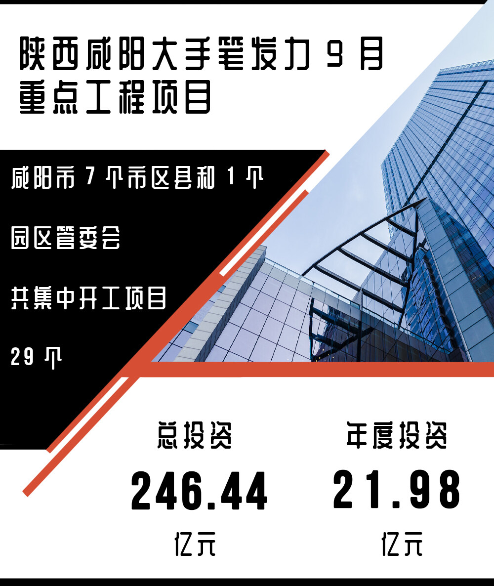 据介绍,9月份,咸阳市7个市区县和1个园区管委会共集中开工项目29个,总投资246.44亿元,年度投资21.98亿元。其中,市级重点项目4个,县级项目25个,项目性质涵盖创新驱动、先进制造业、传统产业转型升级、现代服务业、高端能源、水利和农业农村、社会事业与文化旅游、新型城镇化、交通基础设施、生态环境等10个领域。