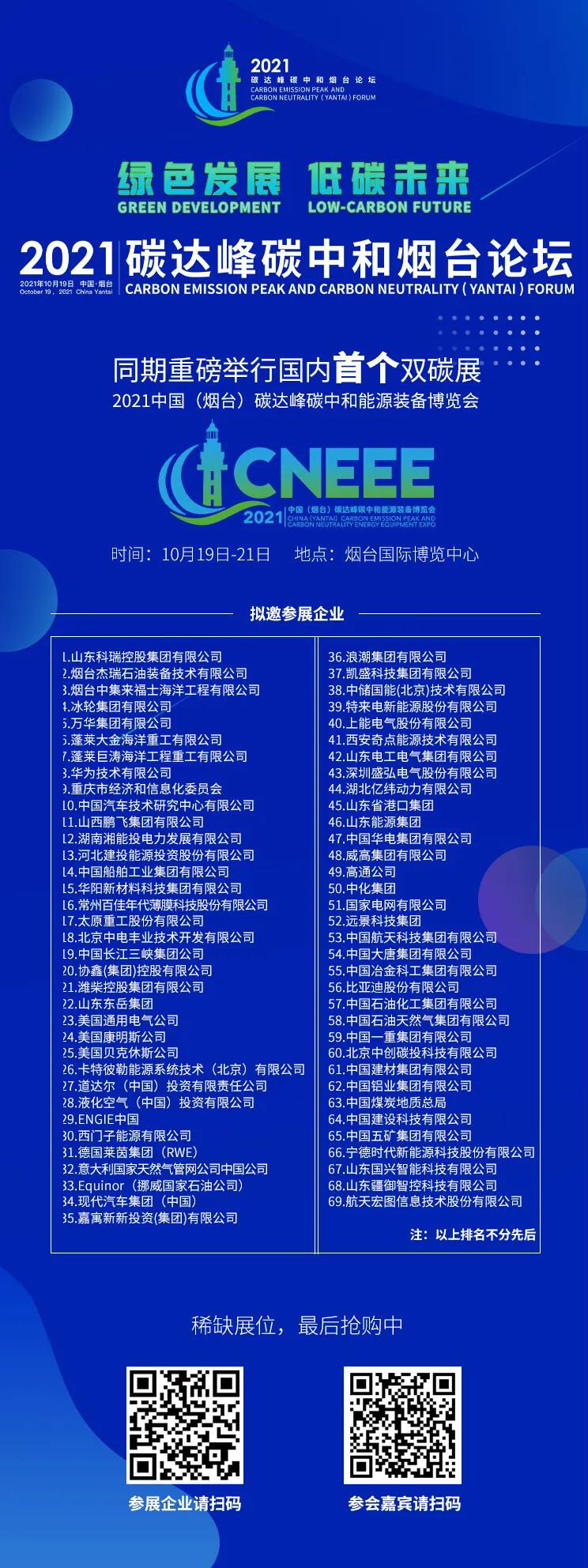 为加快构建清洁低碳能源体系,进一步扩大合作、共享智慧,高质量推动碳达峰碳中和目标实现,由山东省发展和改革委员会、烟台市人民政府、中国核学会、中国机械工业联合会、中国能源报社主办,烟台市发展和改革委员会、烟台市新兴产业发展推进中心、烟台众创核电研发中心承办的“2021碳达峰碳中和烟台论坛”将于10月19日—21日在山东省烟台市举办。论坛期间,将同步举办中国核学会2021年学术年会、2021中国(烟台)核能安全暨核电产业链高峰论坛、2021中国国际核电工业及装备展览会、2021中国(烟台)碳达峰碳中和能源装备博览会、新时代核工业精神宣讲晚会等活动。