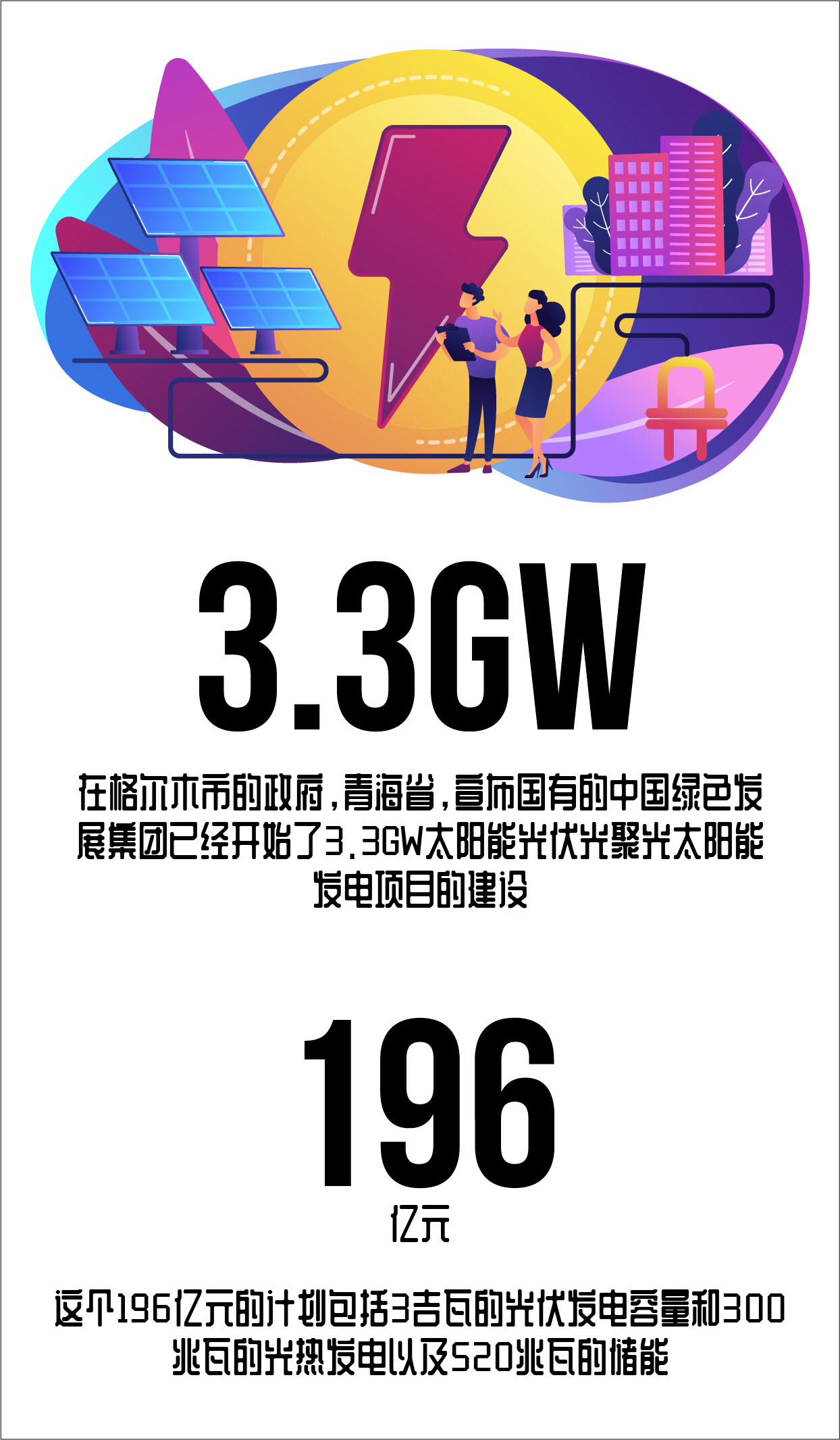 在格尔木市的政府,青海省,宣布国有的中国绿色发展集团已经开始了3.3GW太阳能光伏光聚光太阳能发电(CSP)项目的建设,这个196亿元人民币(30.4亿美元)的计划包括3吉瓦的光伏发电容量和300兆瓦的光热发电以及520兆瓦的储能。格尔木市公告没有提供该项目存储元件的兆瓦时存储数据。可再生能源领域计划于2025年完工,是中国“十四五”规划的一部分。