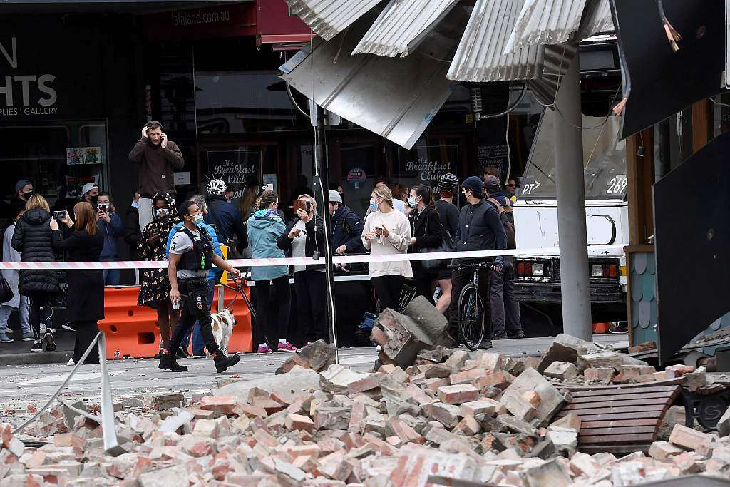 现场视频显示,墨尔本市教堂街上的建筑物受损严重,街道上出现大面积的建筑物碎块。教堂街聚集了大型商场和众多餐馆,其中一幢建筑的房顶侧面墙体完全塌落,地面散落大量砖块,连接的电缆被压断,挡住了附近来往的车辆。路过的行人看到这副场景,纷纷驻足围观,并拿出手机记录下这些画面。