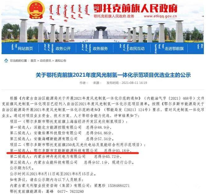根据内蒙古鄂托克前旗人民政府网站信息,鄂尔多斯市鄂托克前旗250兆瓦光伏电站及氢能综合利用示范项目优选业主结果公示结束,京能电力(600578)下属鄂尔多斯市京能新能源科技有限公司以总得分93.18分排名第一中标,目前已收到鄂托克前旗能源局下发的优选成交通知书,现基本具备开工建设条件。该新能源项目的成功中标,标志着京能电力布局新能源产业项目再次取得实质性进展,在公司转型发展过程中具有里程碑意义。