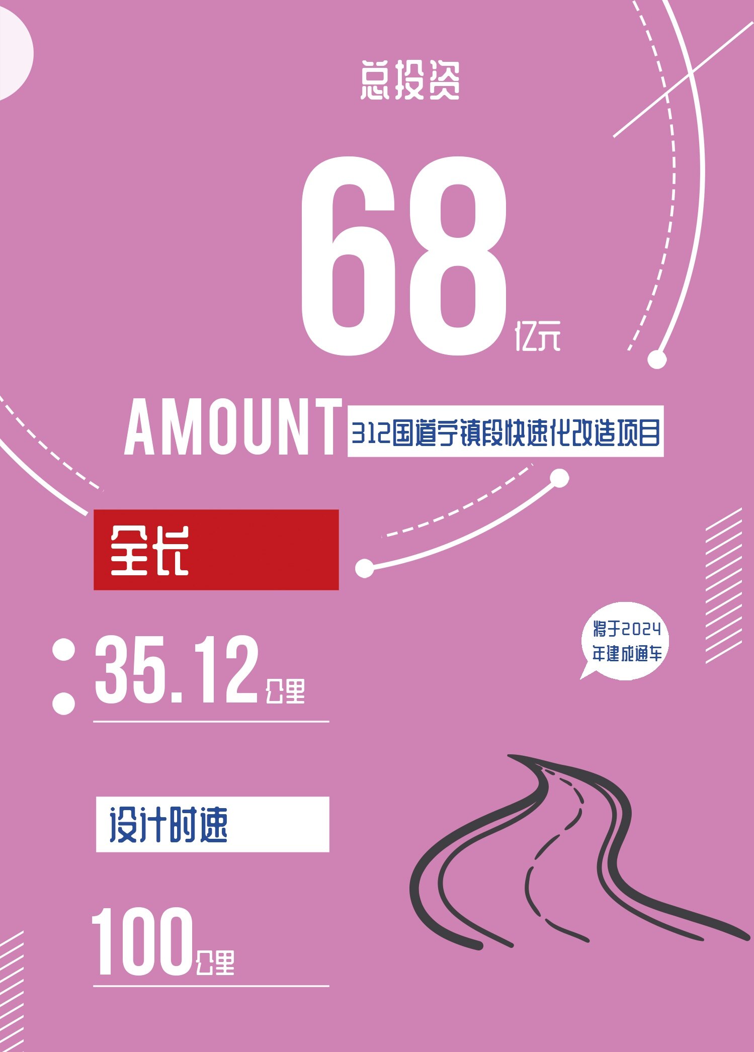 据介绍,该项目东起镇江戴家门,向西沿312国道至宁镇交界处,全长35.12公里,主路采用双向六车道一级公路标准,全线不设红绿灯,设计速度100公里/小时,估算总投资68亿元。根据建设序时安排,将于2024年建成通车。