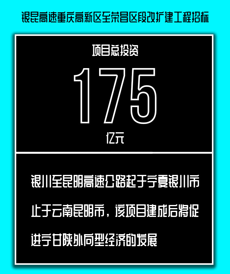 2021年9月29日,重庆市交通局发布了银昆高速重庆高新区至荣昌区川渝界段改扩建工程发布了招标公告,该项目位于重庆高新区,项目总投资175亿元。
