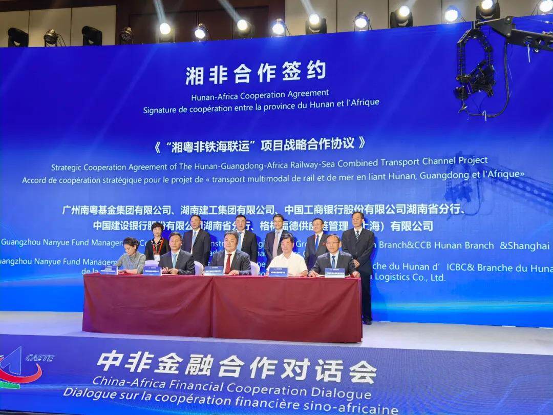 9月27日下午,第二届中非经贸博览会中非金融合作对话会上,作为湖南现代物流产业基金发起方,湖南建工集团、广州南粤基金集团、中国工商银行湖南省分行、中国建设银行湖南省分行与上海格林福德公司签署“湘粤非铁海联运”项目战略合作协议,成为湘非合作协议的重要成果之一。集团党委副书记、总经理李湘波出席会议并代表集团签约。