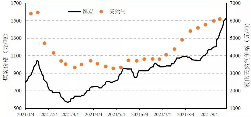 用电需求处于高位、火电企业“越发越亏”所产生的电力供需矛盾,是集中限电的直接原因。1-8月份,我国全社会用电量累计54704亿千瓦时,同比增长13.8%,其中工业用电贡献了2/3的增量。尽管8月以来工业用电增幅放缓,但总体仍处于高位。与此同时,作为主力电源的火电持续遭遇难以承受的高煤价和高气价。与年内最低值相比,9月下旬的煤炭和天然气价格已超过100%和80%,达到1522元/吨和6086元/吨(见图1)。由于燃料价格无法通过电价传导,8月以来,火电企业普遍出现“越发越亏”的运行亏损现象,每度电亏损约0.2元,行业亏损面超过90%。由燃料价格过高引起的电力供应经济性短缺是此轮各地电力供需失衡的直接原因。