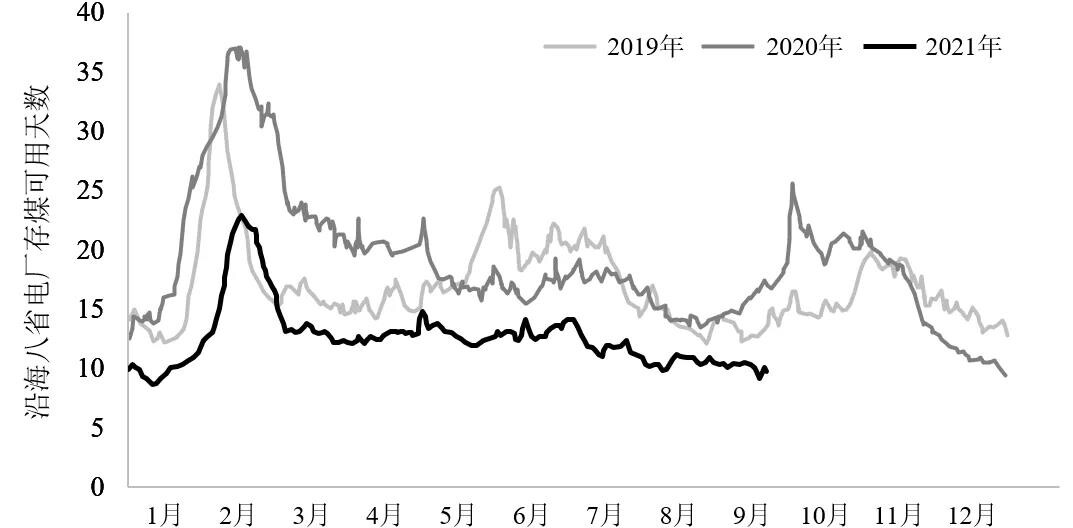 二是电厂煤炭库存严重不足,加剧电力保供压力。按照火电运行规律,迎峰度夏后,电厂需在第三季度补库存,为冬季保供做好准备。然而由于煤价持续高企,电厂补库存进展缓慢(见图3)。尽管相关部门于4月和7月两次强调加强煤炭储备并保证电厂库存水平,但截至9月中旬,全国大部分电厂存煤始终处于10天左右的低位。