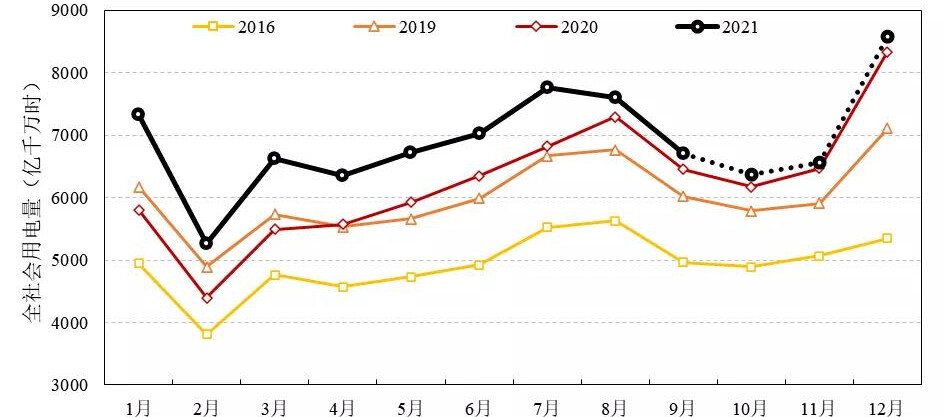 一是冬季用电高峰恐超夏季,电力供需偏紧格局难以转变。参考近五年的月度同比增长趋势,第三产业和居民用电在四季度的增幅有望保持在过去五年的平均水平,工业用电在四季度会由于去年基数低开高走而进一步放缓。综合以上分析,2021年四季度全社会用电量月度增幅有望回落至3%左右,较1-8月明显放缓。不过逐月测算表明,12月的全社会用电量预计突破8500亿千瓦时(见图2),较夏季7月高峰多830亿千瓦时,较去年12月冬季高峰还会增加200亿千瓦时;加上寒冷天气还可能使最大电力负荷进一步抬升。