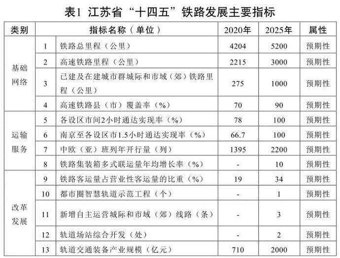 日前,江苏省政府办公厅近日印发江苏省“十四五”铁路发展暨中长期路网布局规划,明确到2025年,江苏新增铁路里程约1000公里,总里程达到5200公里。高速铁路里程约3000公里,覆盖所有设区市和90%左右县(市)。省会南京与国家主要城市群4-6小时通达,与长三角中心城市1小时通达,与各设区市1.5小时通达。