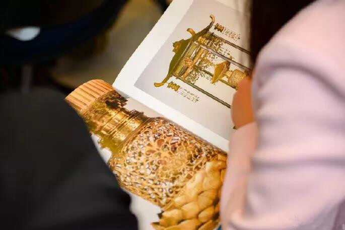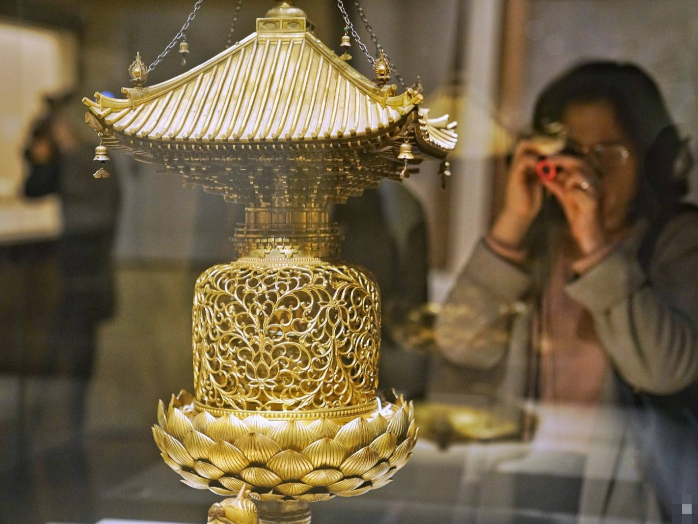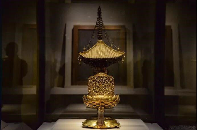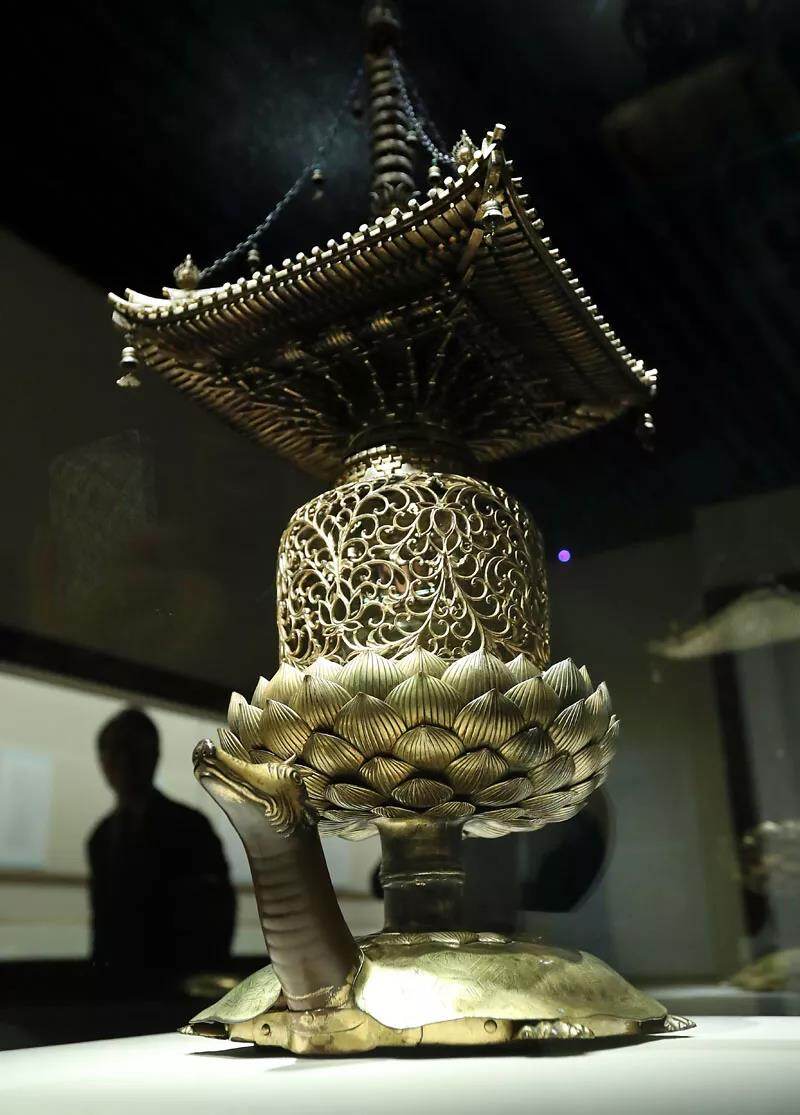 金龟舍利塔是为供奉鉴真带去日本的舍利而铸造的容器。舍利塔为铜铸鎏金,塔顶屋檐等各部分均按照宝塔的建筑结构制造,塔身采用透雕工艺刻画了藤蔓花纹,透过花纹可以看到存放舍利的唐代琉璃瓶,瓶中存放着鉴真带去日本的舍利,此番是首度回到故乡展出。