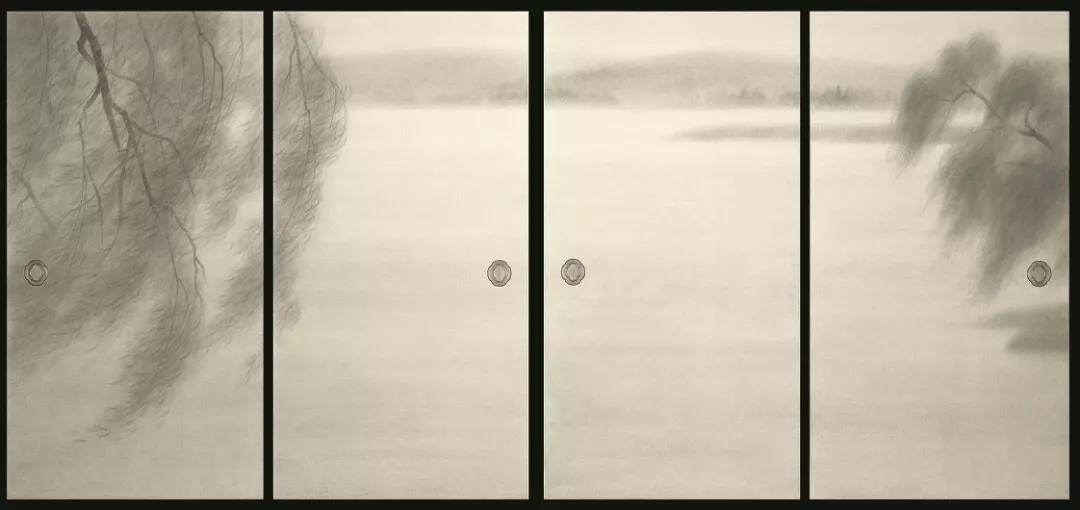 在唐招提寺御影堂安放鉴真和尚坐龛的正房,画的便是《扬州熏风》。“这是东山魁夷第一次也是最后一次用水墨作画,画中可见扬州瘦西湖上雾气蒙蒙,风吹拂着杨柳,就像唐诗里描绘的‘烟花三月下扬州’的景象,那是鉴真最熟悉的故乡风景。”擅用色彩的东山魁夷为何要用水墨作画?由于鉴真是中国人,却永远留在日本,因此东山魁夷用中国的水墨描绘中国山水的方式,让他仿佛回到故乡扬州,以此纪念这位先贤。这些从构思到制作完成花费了10年心血的巨制,是东山魁夷创作生涯中的一个里程碑。