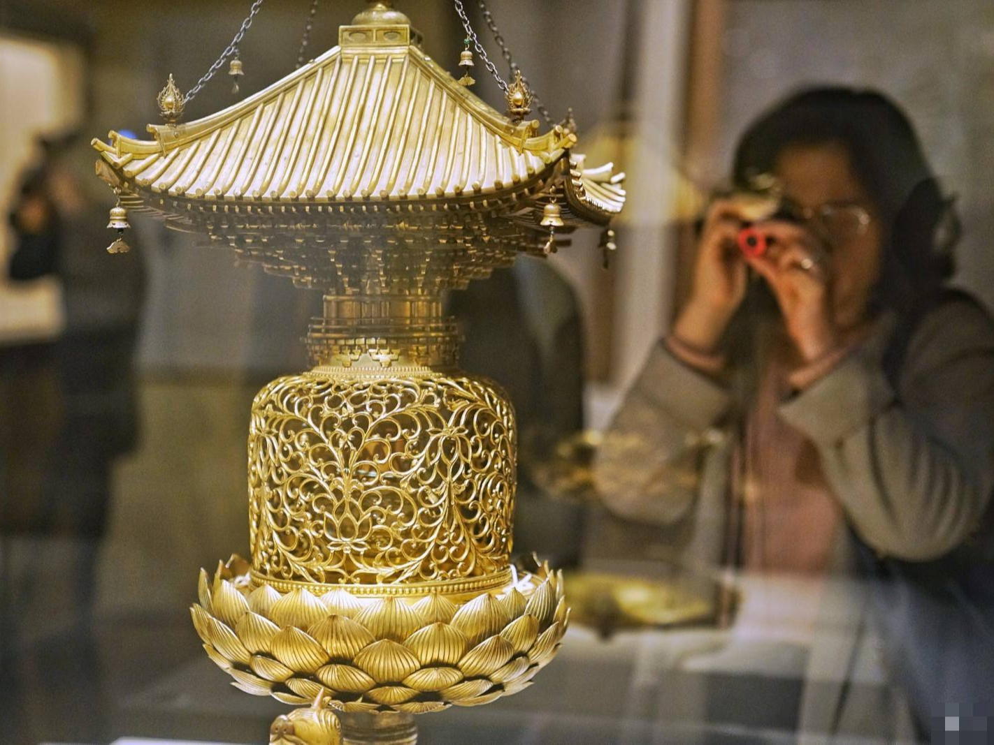 The Gold Turtle Stupa is a container made to worship the relics that Jianzhen brought to Japan. The stupa is made of bronze and cast gold, and the roof eaves and other parts are manufactured in accordance with the building structure of the pagoda. The body of the tower is carved with vines through openwork. Through the pattern, you can see the Tang Dynasty glass bottles that store stupas. Jian Zhen took the relics to Japan, this is the first time to return to his hometown to exhibit.