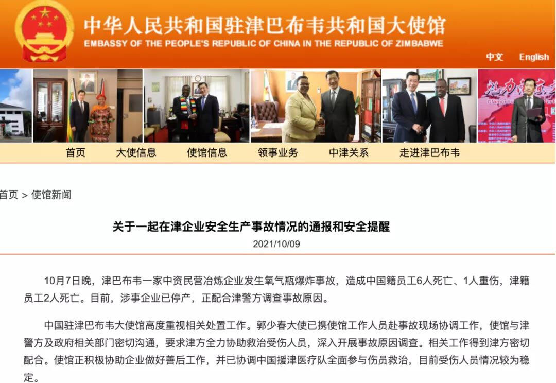 见道网从中国驻津巴布韦大使馆官网获悉,2021年10月7日晚,津巴布韦一家中资民营冶炼企业发生氧气瓶爆炸事故,造成中国籍员工6人死亡、1人重伤,津籍员工2人死亡。目前,涉事企业已停产,正配合津警方调查事故原因。