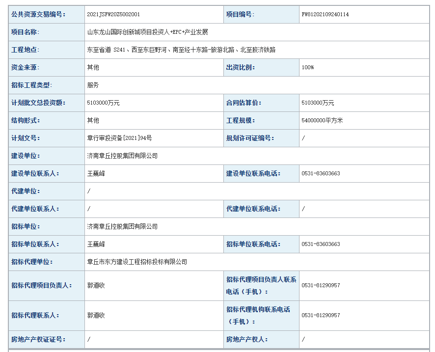 2021年10月11日,山东济南公共资源交易中心发布了《山东龙山国际创新城项目投资人+EPC+产业发展招标公告》。总规模54平方公里,计划投资510亿元!