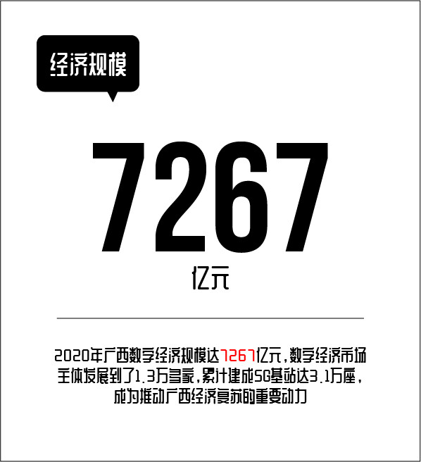 With the continuous consolidation of Guangxi's digital infrastructure construction and the continuous release of the vitality of the digital economy, the scale of Guangxi's digital economy will reach 726.7 billion yuan in 2020, and the number of digital economy market entities will grow to more than 13,000, and a total of 31,000 5G base stations have been built, which has become a driving force for Guangxi. An important driving force for economic recovery.