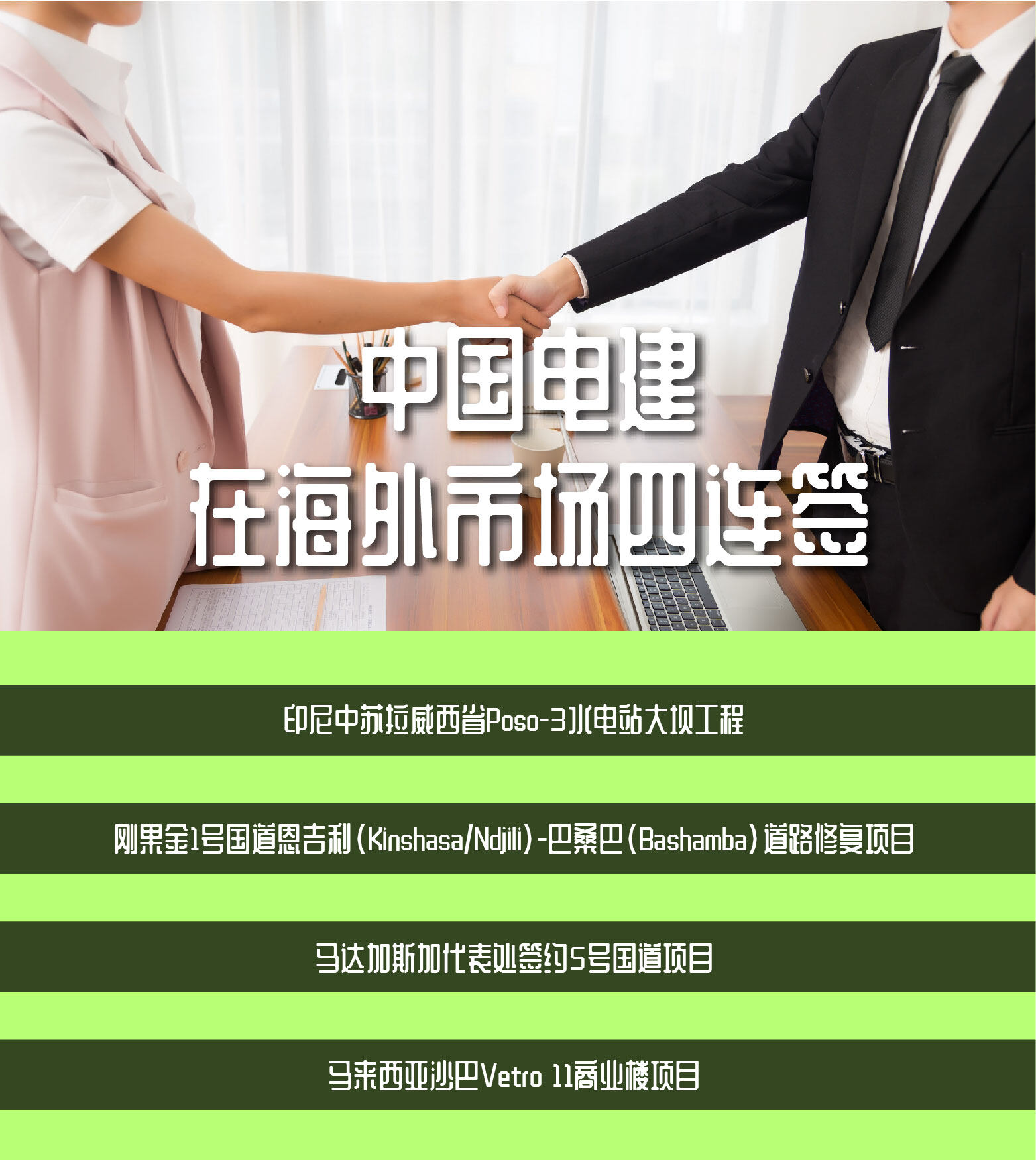 中国电建在海外市场连签四单,此次签约覆盖亚非大陆,对于公司持续发力海外市场具有重大意义。
