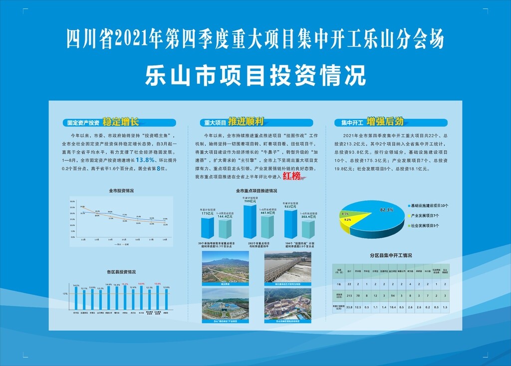 2021年10月8日,四川省第四季度重大工程项目集中开工在乐山市分会场正式举行。据悉,此次乐山共有22个项目集中开工,总投资213.2亿元,开建重大项目涵盖交通、能源、城建、工业、农田水利、公共服务等多个领域。