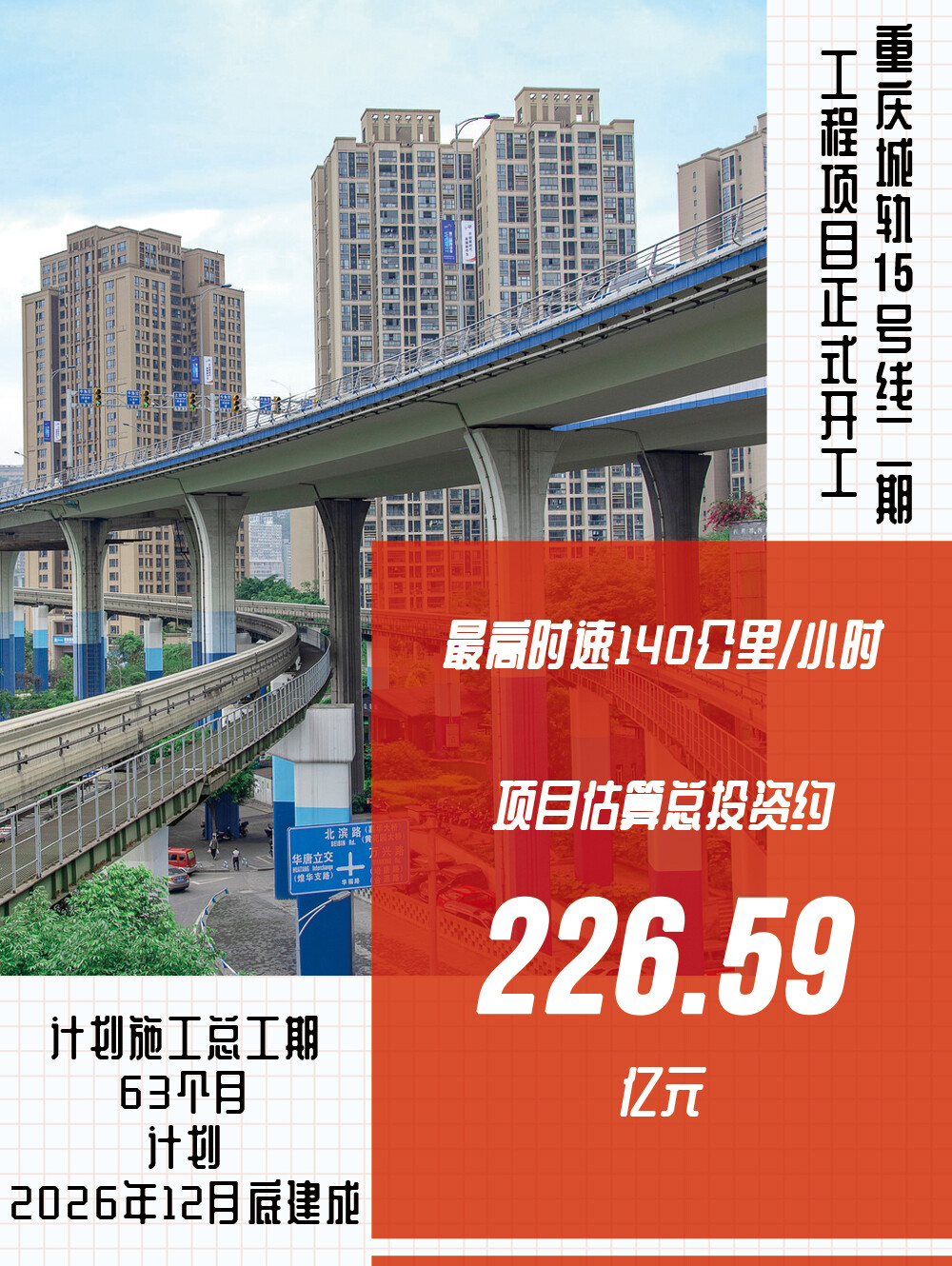 重庆城轨快线15号线二期线路全长约32.8公里,共设站11座,采用最高运行速度140公里/小时、25KV交流制式的城轨快线车辆。项目估算总投资约226.59亿元,计划施工总工期63个月,计划2026年12月底建成。