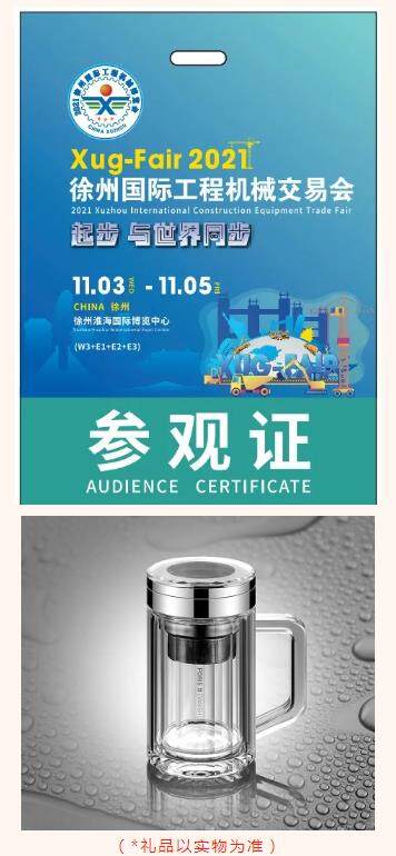 观展福利一:将此文连续转发朋友圈3天附带文字:11月3日-5日,一起去参观2021徐州国际工程机械交易会。即可在活动区,获得展会参观证+精美水杯一个,限前1000个/天。
