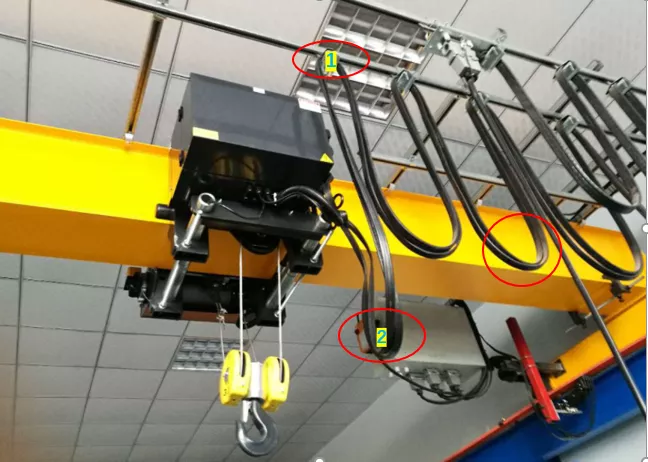 悬挂线:是将多根电缆吊装在钢架上,往复收缩展开运动。起重机使用的电缆大多自重很大,导致悬吊在钢结构处的电缆(红框1位置)应力集中,受到过大的拉力。由于重力和反复收缩拉伸作用,电缆弯折加剧(红框1和2位置处),弯曲半径过小,易造成电缆疲劳受损,加速电缆断芯,从而引起故障。如下图: