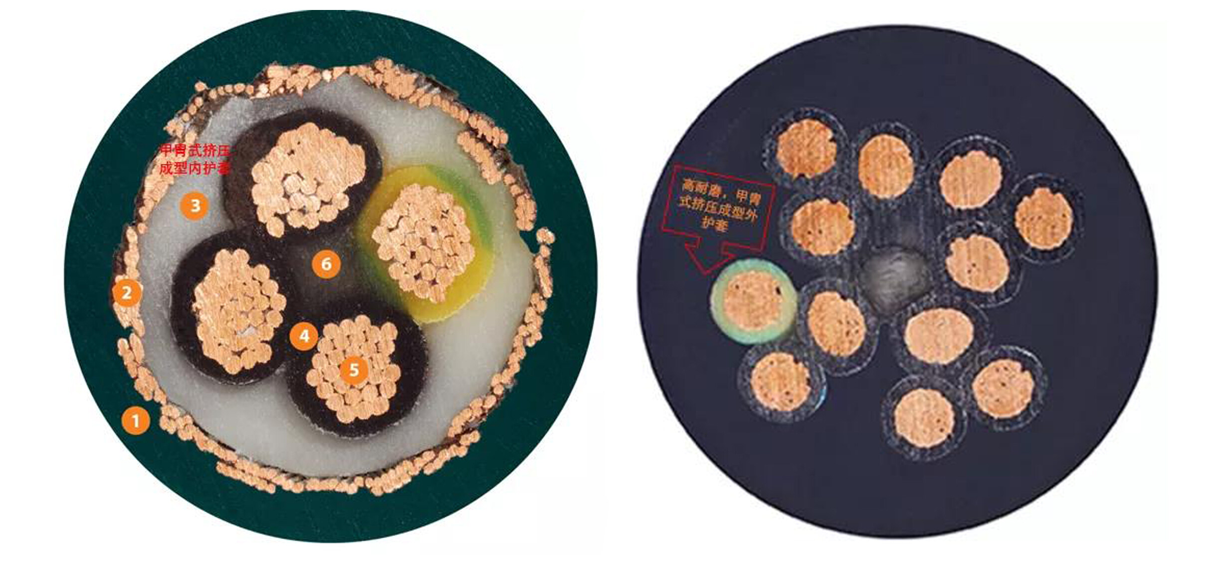 通过高压挤压成型的内外护套(见下图),确保绞合结构在纵向有效固定,使得电缆结构紧凑,在运动过程中不易发生芯线和护套相对位移,有效防止芯线的磨损和断裂。