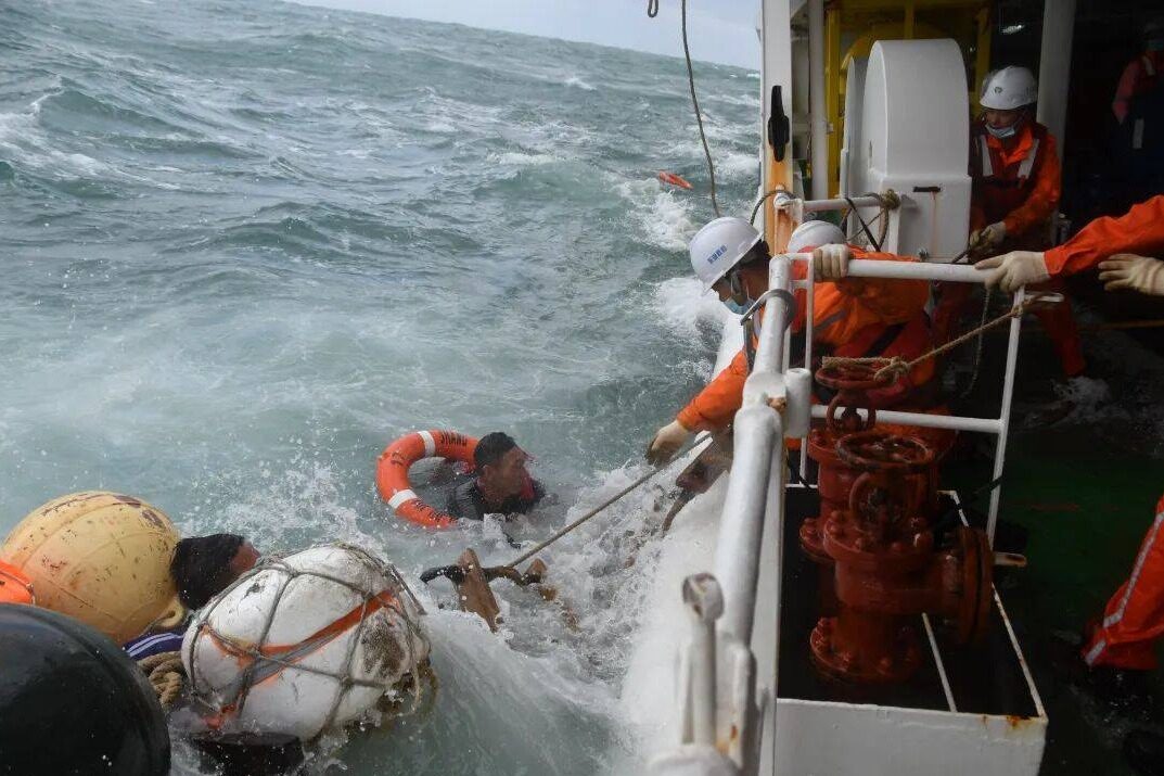 10月17日7点40分,东海救助局救助直升机B-7356抵达现场,机组人员发现遇险渔船已经完全沉没,并在附近海域发现有两名船员漂浮在海上,机组人员将两名落水船员位置告知正在附近搜救的“东海救101”轮。收到指令后,“东海救101”轮立即全速靠近遇险船员,经过紧张作业,救助人员将2名落水船员救起。