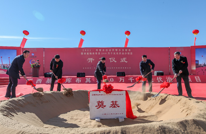 2021年10月16日,内蒙古蒙西基地库布其200万千瓦光伏治沙项目在内蒙古鄂尔多斯市杭锦旗库布其沙漠亿利生态示范区“绿水青山就是金山银山”实践创新基地举行开工仪式。这标志着中国光伏治沙、生态综合治理进入了新阶段,是绿水青山就是金山银山理念的有效实践,又是落实碳达峰、碳中和目标和黄河流域生态保护和高质量发展的重要行动。