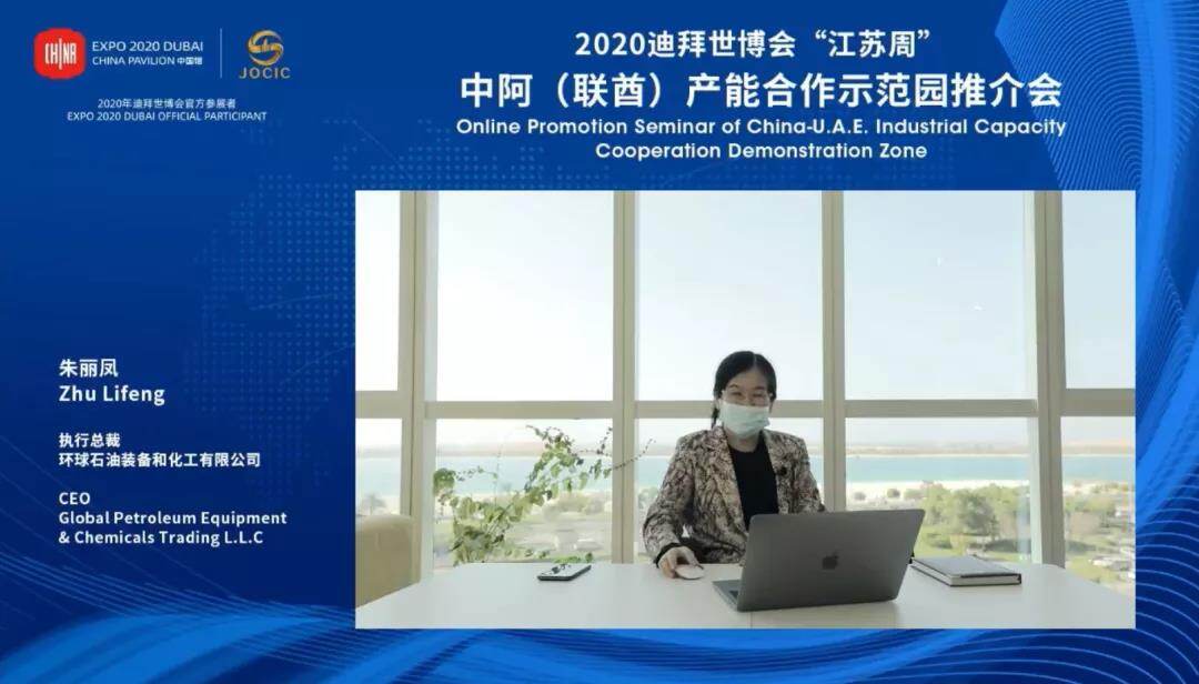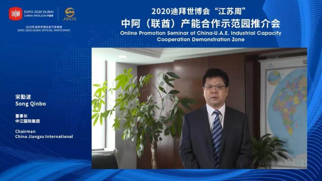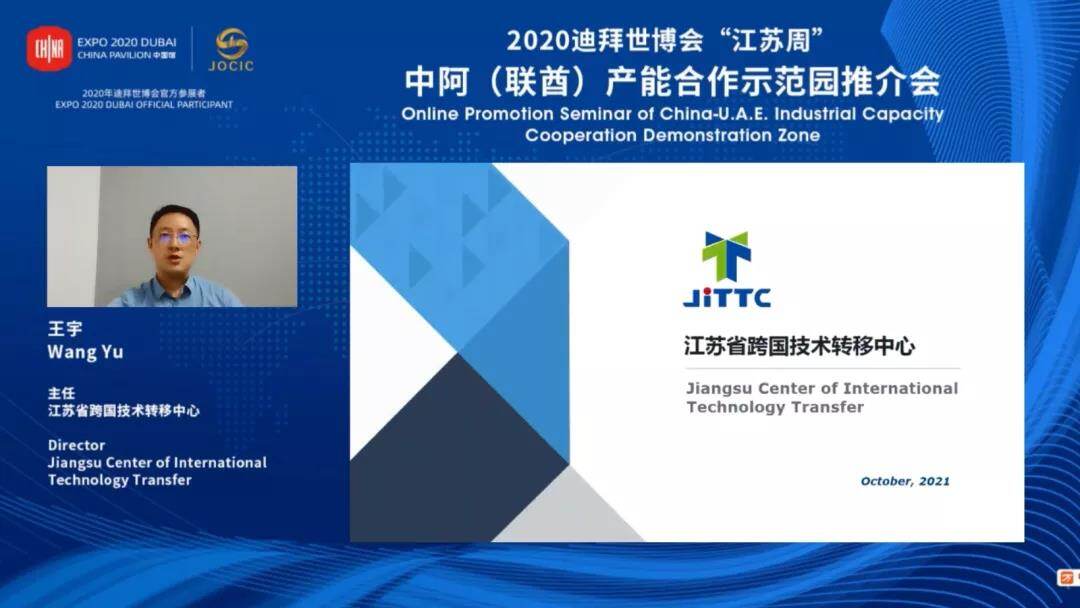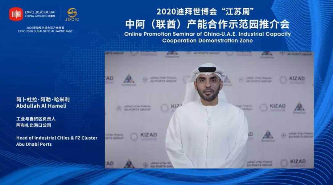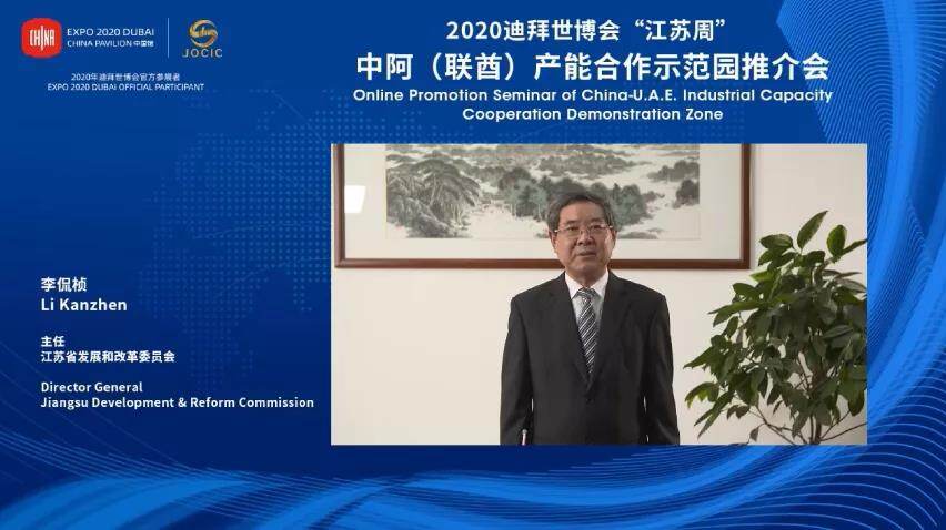 10月19日,迪拜世博会“江苏周”系列活动-中阿(联酋)产能合作示范园推介会在线上举办。此次会议主要展示江苏一带一路交汇点建设成果,并重点推介中阿两国共建一带一路重大合作项目-中阿产能合作示范园。阿联酋驻华大使阿里·扎希里、国家发改委外资司副司长张建华、江苏省发改委主任李侃桢、阿布扎比港口公司工业与自贸区负责人阿卜杜拉·阿勒·哈米利、中江国际集团董事长宋勤波等与会并致辞。迪拜世博会“江苏周”活动工作领导小组成员单位、国内外相关机构、“走出去”重点企业代表、中东及北非地区中资企业代表、部分阿联酋及周边国家和地区企业代表约300余人在线参会,近60万人在线观看活动直播。