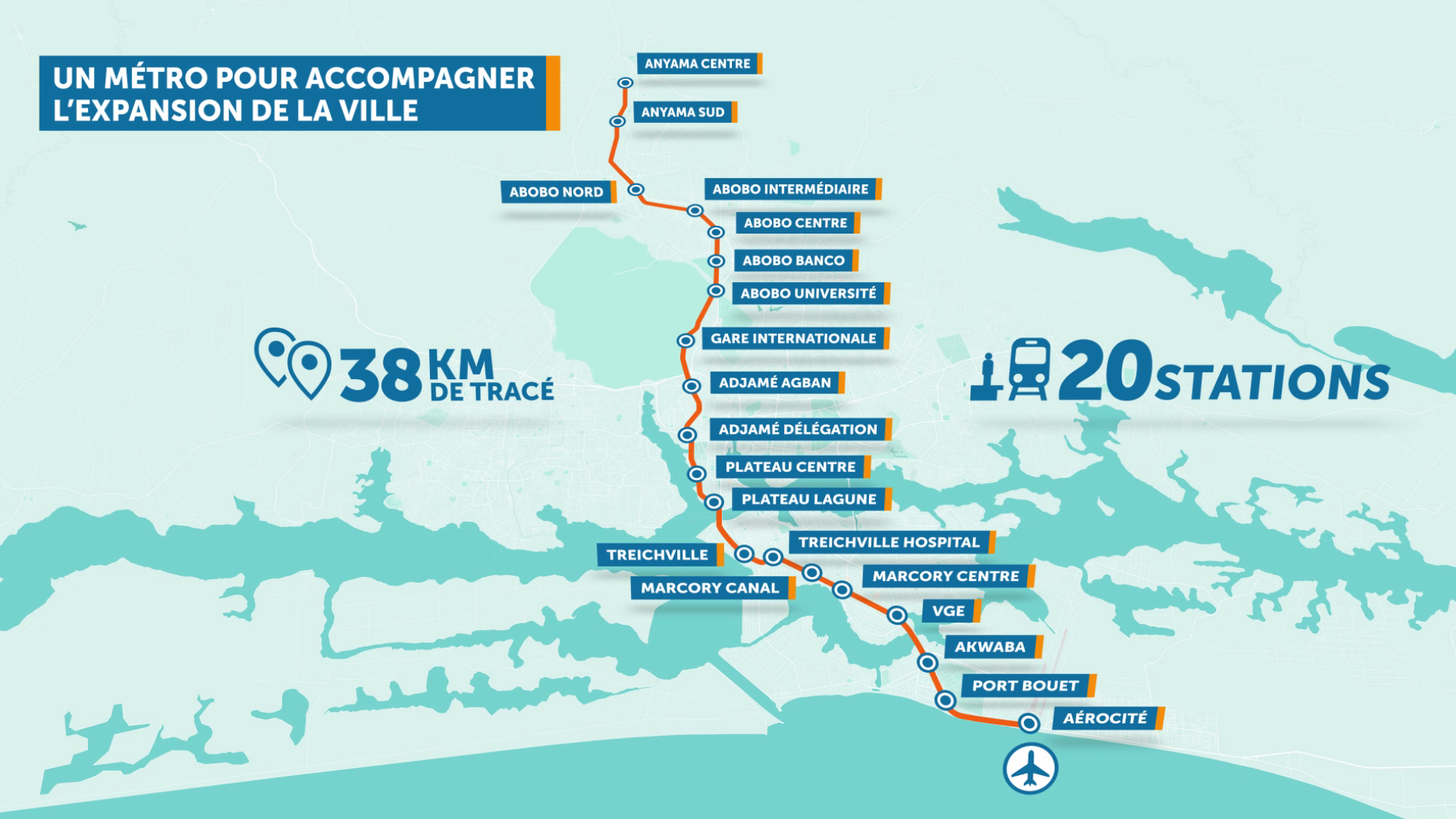 这条长达37公里的线路将包括18个车站,将从北部的安山中心到南部的阿比让机场。该项目包括24座桥梁,一座高架桥在ÉbriéLagoon上,34条人行道和8条地下人行道。
