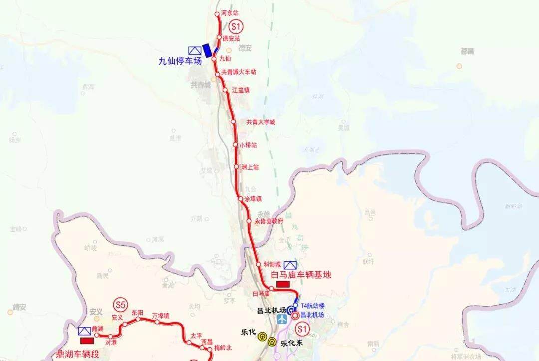 S1(赣江新区线)一期工程:线路起于昌北机场站,与地铁快线8号线贯通运营,与10号线换乘衔接,与昌九高铁、昌北机场换乘,终于德安县河东乡站。