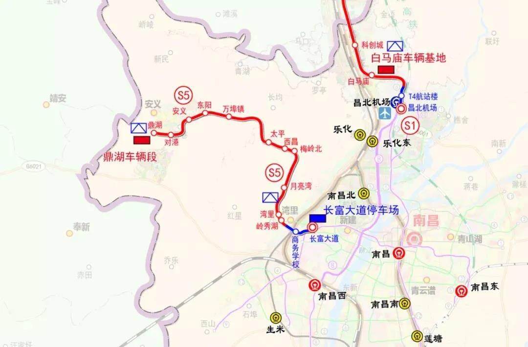 S5(昌安线)一期工程:线路东起南昌市新建区长富大道与工业四路口的长富大道站,规划与地铁快线9号快线贯通运营,与7号线换乘衔接,西至安义县城北潦河南岸的鼎湖镇。