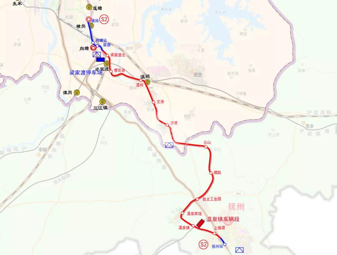 S2(昌抚线)一期工程:线路北起南昌县昌赣高铁横岗站,与拟建的3号线南延段换乘衔接,预留与地铁快线10号线贯通运营条件,南至抚州市的抚州站,线路长99.8km,设站15座,平均站间距7.11km。