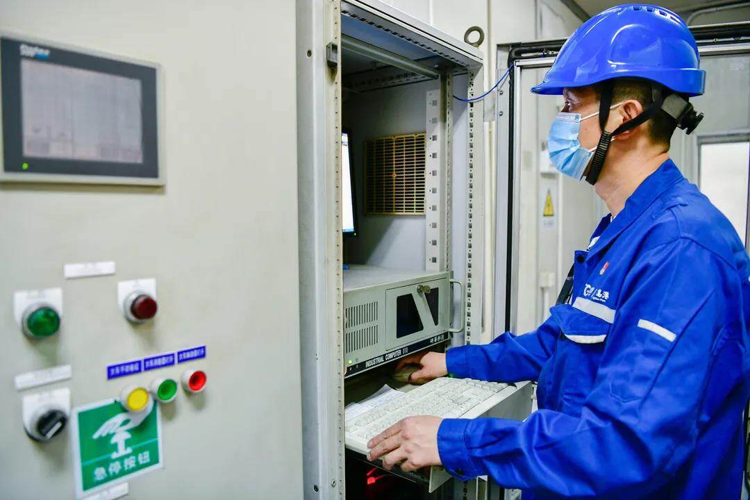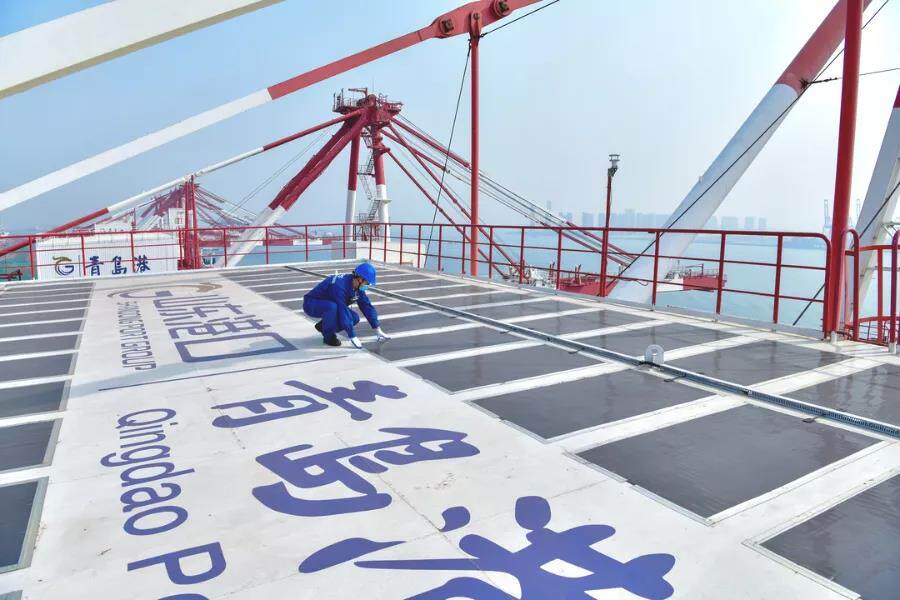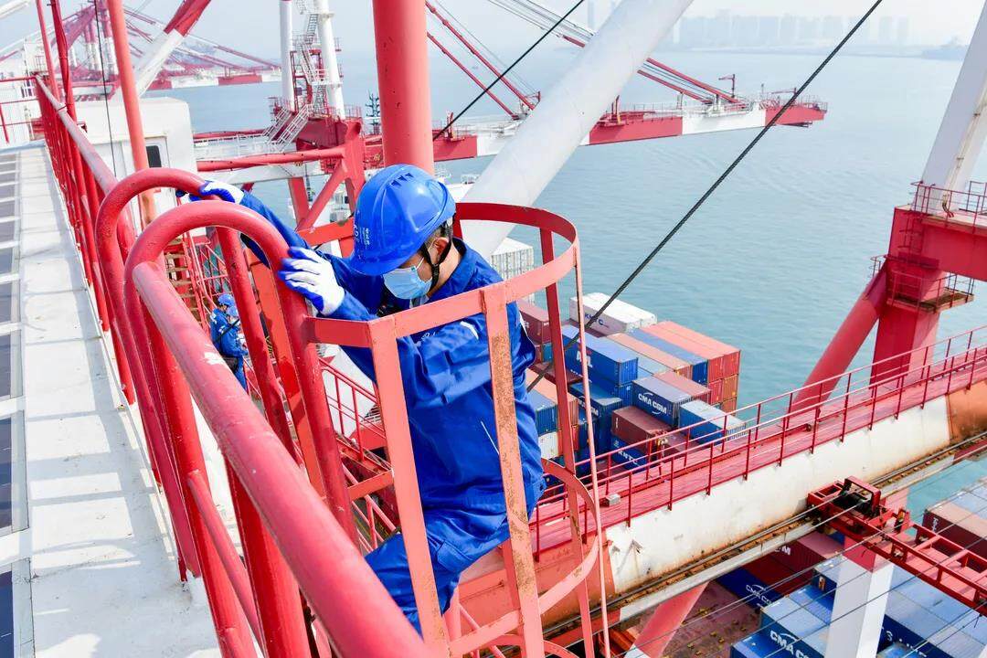 在40米高的桥吊机房房顶,对桥吊光伏发电装置进行日常巡查。