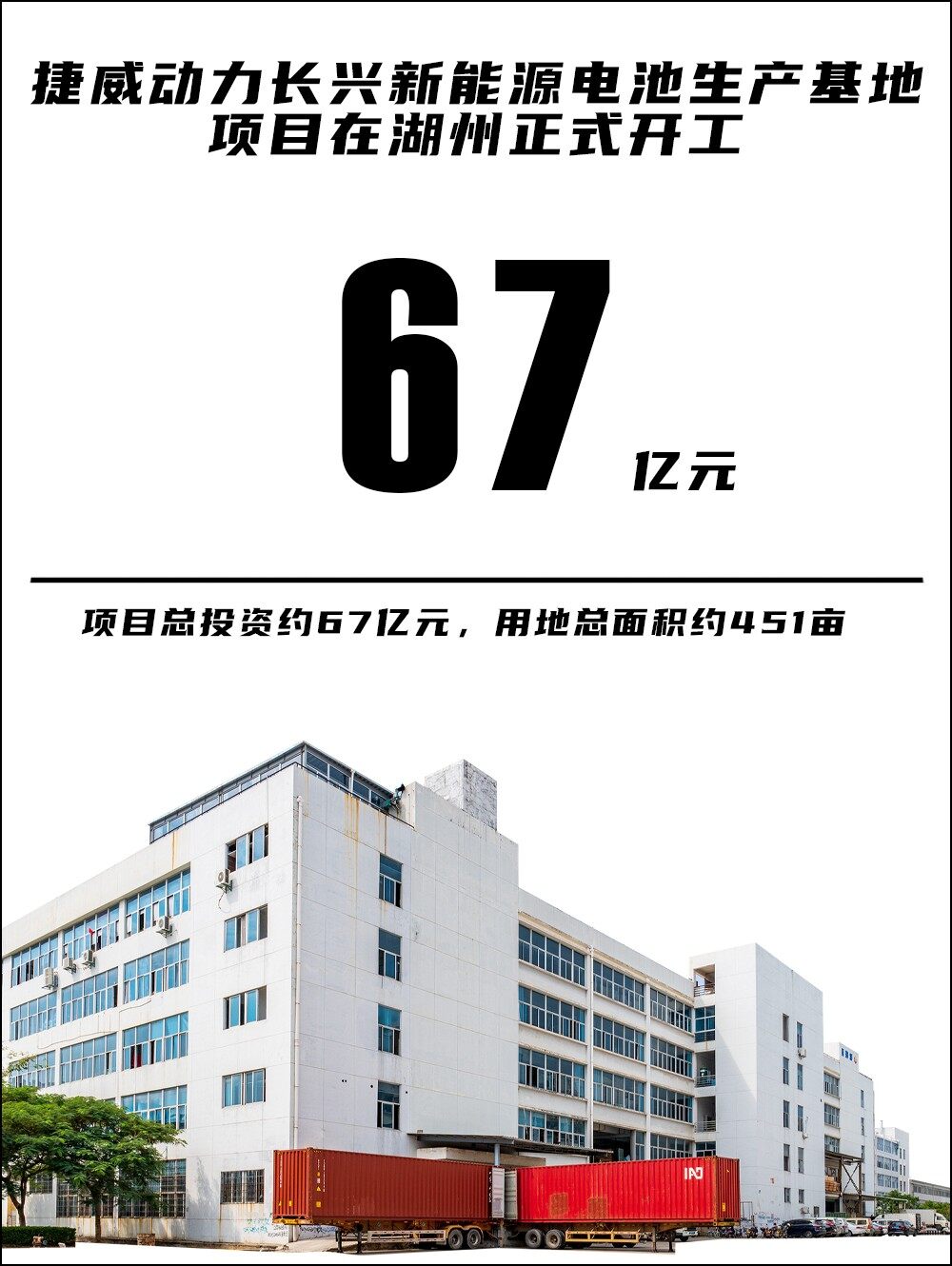 捷威动力长兴新能源电池生产基地项目选址于长兴经济技术开发区绿色智能制造产业园西平台,项目总投资约67亿元,用地总面积约451亩,主要从事新能源电池生产,产品主要应用于储能与动力市场,项目建成达产后可形成18GWh的年产能,预计于2023年初投入使用。